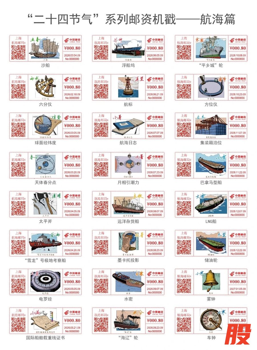 今起至2027年1月20日期间,上海航海邮局联合文汇出版社,将《海魂——走近中国远洋船长》一书中的插图,演绎成二十四节气航海篇彩色邮资机戳。
